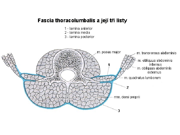 Fascia thoracolumbalis • 3 vrstvy – lamina anterior – lamina media = (původní myoseptum horizontale u ryb) – lamina posterior • uzavírá hluboké zádové svalstvo v bederní krajině • laterálně listy splývají • začínají z ní 2 (ze 3) bočních břišní svalů a m. latisismus dorsi