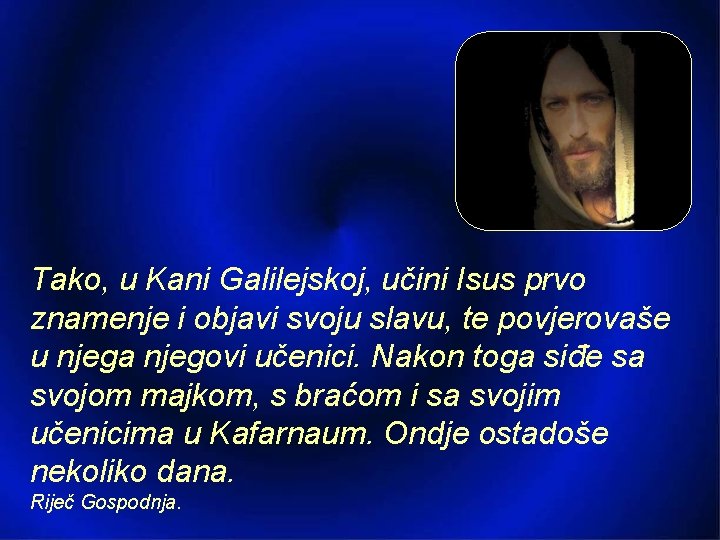 Tako, u Kani Galilejskoj, učini Isus prvo znamenje i objavi svoju slavu, te povjerovaše u njega njegovi učenici. Nakon toga siđe sa svojom majkom, s braćom i sa svojim učenicima u Kafarnaum. Ondje ostadoše nekoliko dana. Riječ Gospodnja.