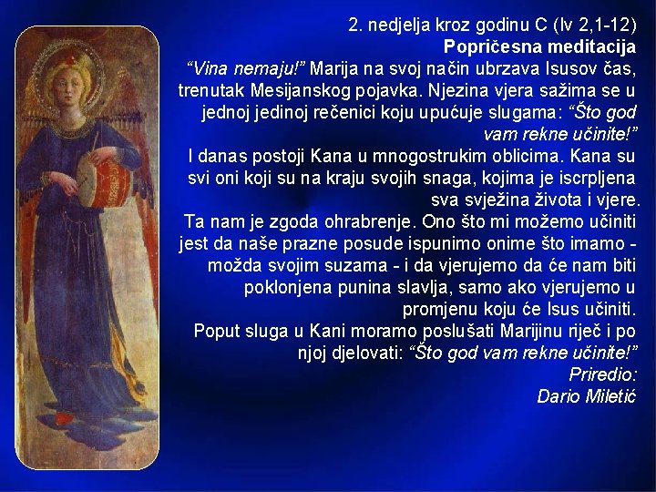 2. nedjelja kroz godinu C (Iv 2, 1 -12) Popričesna meditacija “Vina nemaju!” Marija na svoj način ubrzava Isusov čas, trenutak Mesijanskog pojavka. Njezina vjera sažima se u jednoj jedinoj rečenici koju upućuje slugama: “Što god vam rekne učinite!” I danas postoji Kana u mnogostrukim oblicima. Kana su svi oni koji su na kraju svojih snaga, kojima je iscrpljena svježina života i vjere. Ta nam je zgoda ohrabrenje. Ono što mi možemo učiniti jest da naše prazne posude ispunimo onime što imamo možda svojim suzama - i da vjerujemo da će nam biti poklonjena punina slavlja, samo ako vjerujemo u promjenu koju će Isus učiniti. Poput sluga u Kani moramo poslušati Marijinu riječ i po njoj djelovati: “Što god vam rekne učinite!” Priredio: Dario Miletić