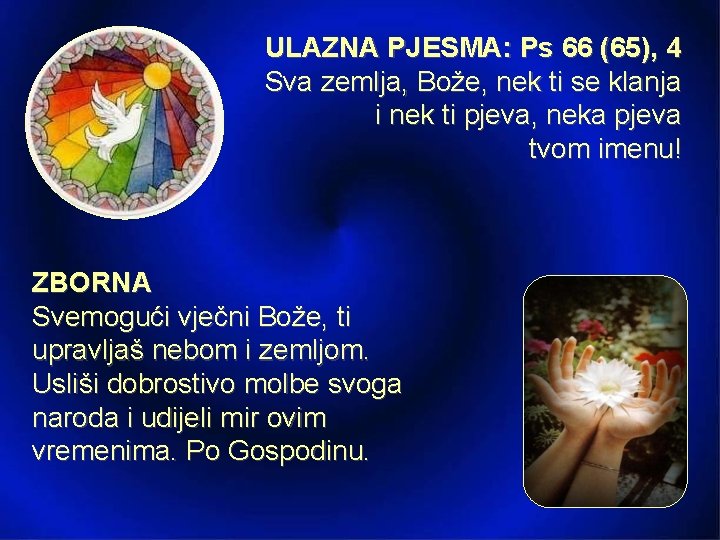 ULAZNA PJESMA: Ps 66 (65), 4 Sva zemlja, Bože, nek ti se klanja i nek ti pjeva, neka pjeva tvom imenu! ZBORNA Svemogući vječni Bože, ti upravljaš nebom i zemljom. Usliši dobrostivo molbe svoga naroda i udijeli mir ovim vremenima. Po Gospodinu.
