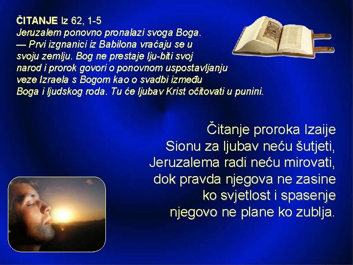 ČITANJE Iz 62, 1 -5 Jeruzalem ponovno pronalazi svoga Boga. — Prvi izgnanici iz Babilona vraćaju se u svoju zemlju. Bog ne prestaje lju biti svoj narod i prorok govori o ponovnom uspostavljanju veze Izraela s Bogom kao o svadbi između Boga i ljudskog roda. Tu će ljubav Krist očitovati u punini. Čitanje proroka Izaije Sionu za ljubav neću šutjeti, Jeruzalema radi neću mirovati, dok pravda njegova ne zasine ko svjetlost i spasenje njegovo ne plane ko zublja.