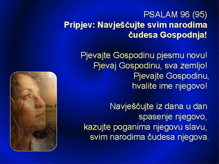 PSALAM 96 (95) Pripjev: Navješćujte svim narodima čudesa Gospodnja! Pjevajte Gospodinu pjesmu novu! Pjevaj Gospodinu, sva zemljo! Pjevajte Gospodinu, hvalite ime njegovo! Navješćujte iz dana u dan spasenje njegovo, kazujte poganima njegovu slavu, svim narodima čudesa njegova.