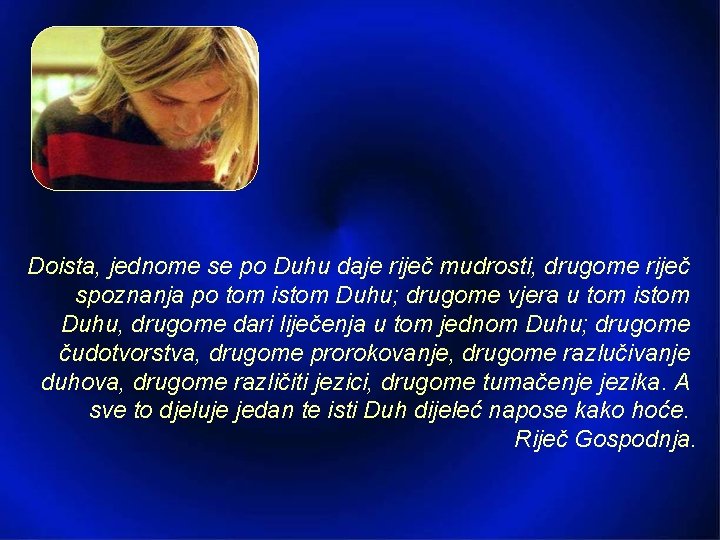 Doista, jednome se po Duhu daje riječ mudrosti, drugome riječ spoznanja po tom istom Duhu; drugome vjera u tom istom Duhu, drugome dari liječenja u tom jednom Duhu; drugome čudotvorstva, drugome prorokovanje, drugome razlučivanje duhova, drugome različiti jezici, drugome tumačenje jezika. A sve to djeluje jedan te isti Duh dijeleć napose kako hoće. Riječ Gospodnja.