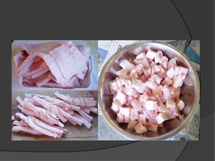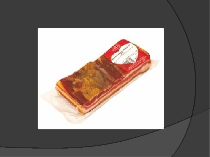 SLANINA Dobiva se soljenjem, salamurenjem, sušenjem, dimljenjem, pečenjem ili kuhanjem čvrstog masnog tkiva svinja s kožom ili bez kože, s dijelovima ili bez dijelova prošaranih mesnim tkivom.