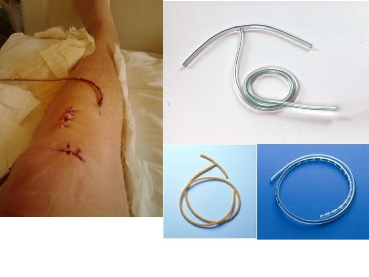 Vrste drenova T-dren -upotrebljava se u drenaži struktura hepatobilijarnog trakta -služi za odvođenje žuči nakon operacije i za injiciranje kontrastnog sredstva u svrhu rtg snimanja žučnih vodova -odstranjivanje nakon 8 -10 dana Redon-drenaža se obavlja pomoću boce s niskim negativnim tlakom -odstranjuje sekret iz rane i pridonosi sljepljivanju rubova rane i cjeljenju rane.