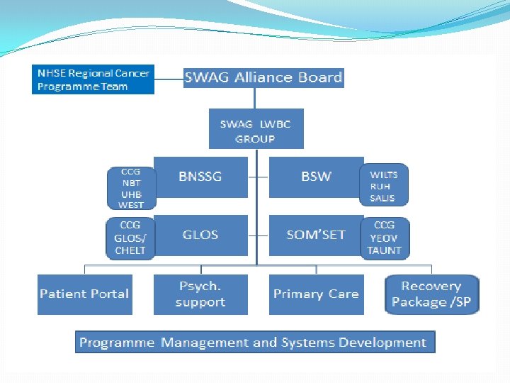 Alliance Programme Governance �Clinical Leadership is provided by Dr Dorothy Goddard as Alliance LWBC Clinical Lead and Chair of the Alliance LWBC group. �There will be a pan –Alliance programme management team made up of the Alliance Programme manager, Macmillan resourced senior project managers and cancer transformation funded (CTF) STP and provider project managers. �The CTF project managers will work in a consistent way and be professionally accountable to the Alliance programme manager and clinical lead in addition to their employing organisation. This will enable the team to work across the alliance and with system wide developments across each STP including primary care and the community to ensure delivery of the Alliance agreed ambitions. �This structure crucial to achieve change at pace both within Trusts but also achieve an equitable and sustainable service across SWAG.