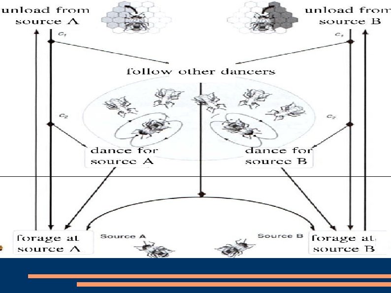 Comparisons Ants use pheromones for back tracking route to food source. Bees instead use Path Integration. Bees are able to compute their present location from past trajectory continuously. So bees can return to home through direct route instead of back tracking their original route. Does path emerge faster in this algorithm.