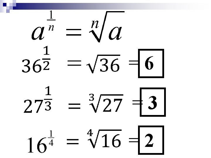 What numbers are perfect squares? 1 • 1=1 2 • 2=4 3 • 3=9 4 • 4 = 16 5 • 5 = 25 6 • 6 = 36 49, 64, 81, 100, 121, 144, . . .