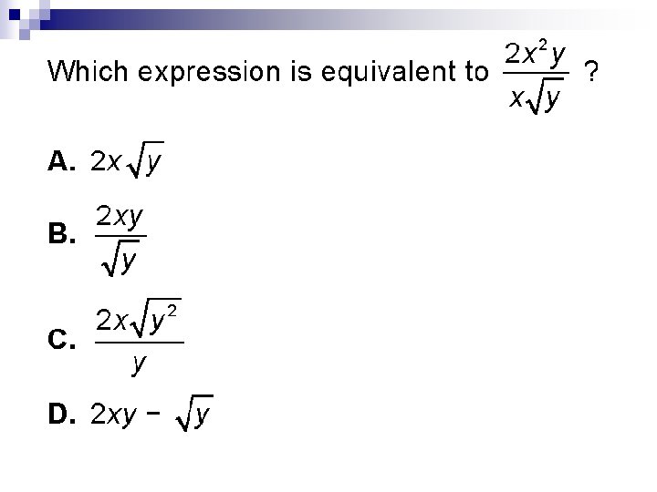 10. Simplify 1. 2. 3. 4. 3 x 6 3 x 18 6 9 x 18 9 x As a general rule, divide the exponent by two. The remainder stays in the radical.