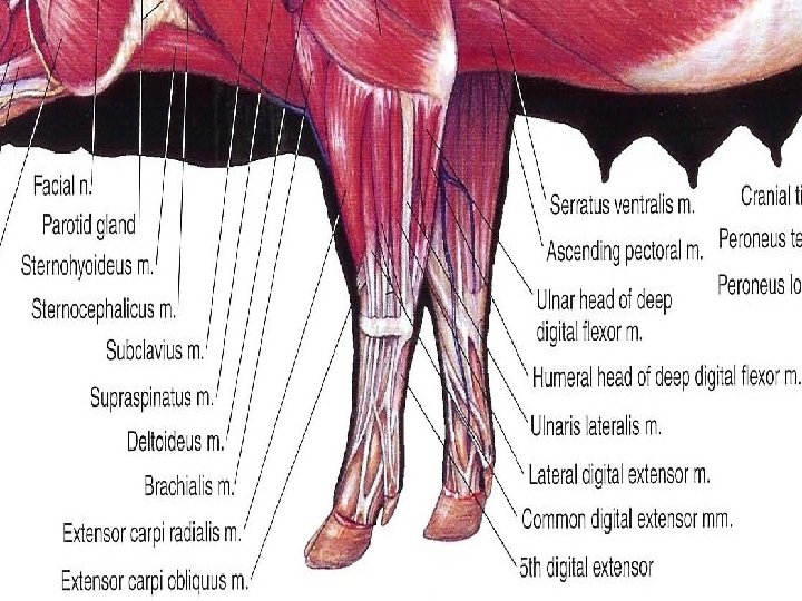 Muscle Name Insertion Innervation Posterior interosseous nerve, the continuation of the radial nerve Origin Extensor carpi ulnaris Base of the 5 th metacarpal Lateral epicondyle of humerus and posterior border of the ulna Deep digital flexor- thoracic The semilunar crest Median and ulnar and the adjacent nerve surface of the cartilage of the third phalanx. Superficial flexor, medial surface of the ulna, the medial border of the radius, and the deep fascia of the forearm. Lateral digital extensor thoracic Fourth and fifth digits. Radial nerve The lateral tuberosity of the radius, the shaft of the ulna, and the lateral ligament of the elbow joint. Common digital extensor The extensor process of the third phalanx. Radial nerve The lateral epicondyle of the humerus and from the ulna.