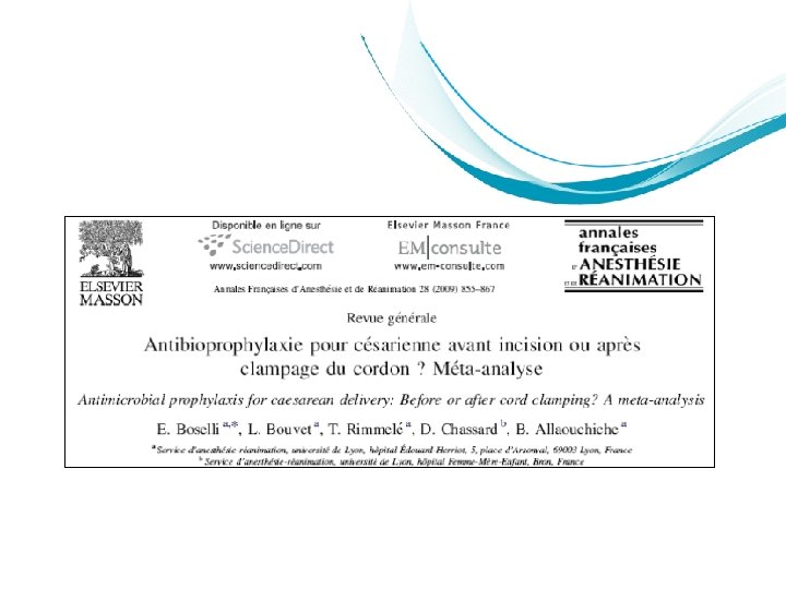 Swiss Association of Obstetric Anesthesia (SAOA) Fall meeting / SSAR 2011 Interlaken, October 27 th, 2011 Antimicrobial prophylaxis for Cesarean delivery: before or after cord clamping? Dr Emmanuel Boselli Anesthesiology and Intensive Care Department Édouard Herriot Hospital, HCL Lyon, France emmanuel. boselli@chu-lyon. fr