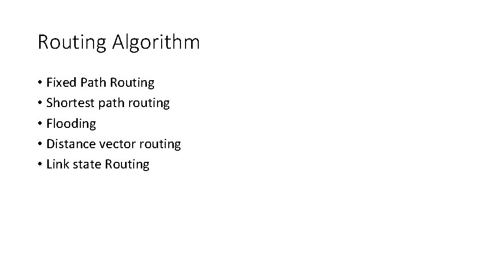 Routing Algorithm • Fixed Path Routing • Shortest path routing • Flooding • Distance vector routing • Link state Routing