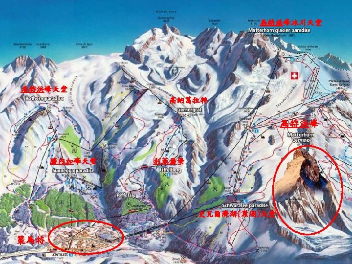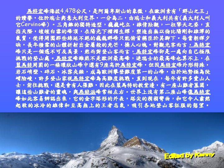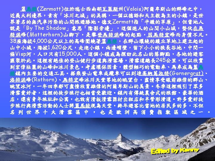 Zermatt is the cliffs on both sides, leaving a small narrow valley in the middle 策馬特的兩側是峭壁,中間留下小小的狹長谷地 All pictures and information obtained from internet Edited by Kenny