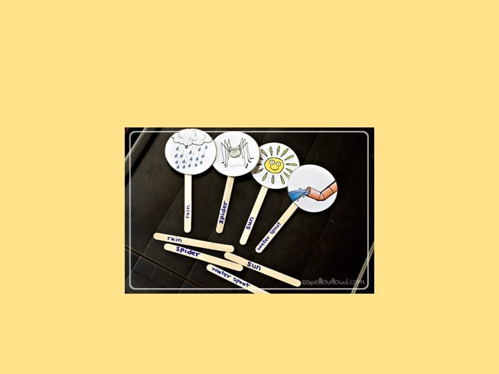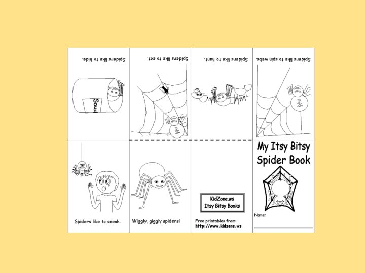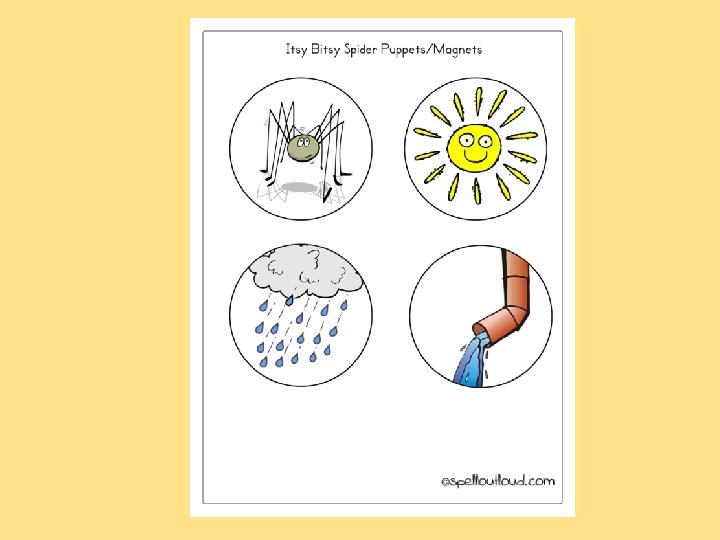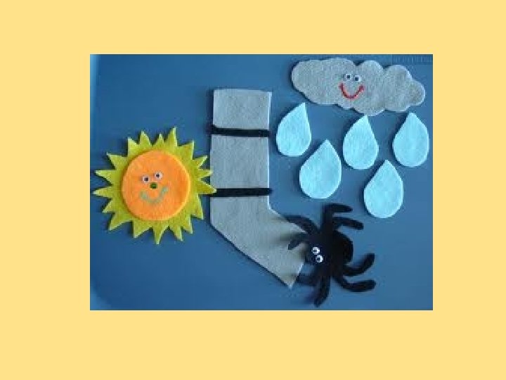 SONG Itsy Bitsy spider went up the water spout. Down came the rain and washed the spider out. Out came the sun and dried up all the rain. Itsy Bitsy spider went up the spout again!