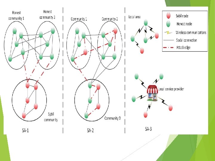 Social Graph-based Sybil Detection (SGSD ) SGSD is to enable the known honest node H to either label any other node S as “Sybil” or “honest, ” or Detect SA-1 according to community detection. Types of SGSD: v Social network-based Sybil detection (SNSD) v social community-based detection (SCSD)
