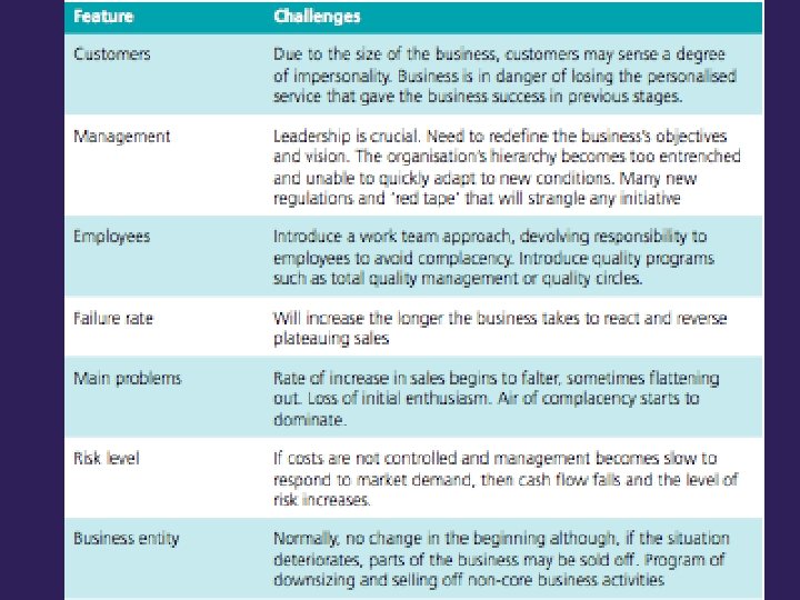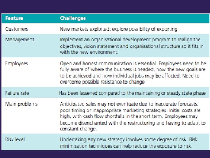 Maturity It requires a great deal of rethinking about how the business should be operated to guarantee survival. At this time, the owner realises that the business could easily lose the energy, enthusiasm and vitality of its earlier times. A sense of complacency often envelops the business, affecting both management and staff. What is now required is a more formal, professional approach to planning