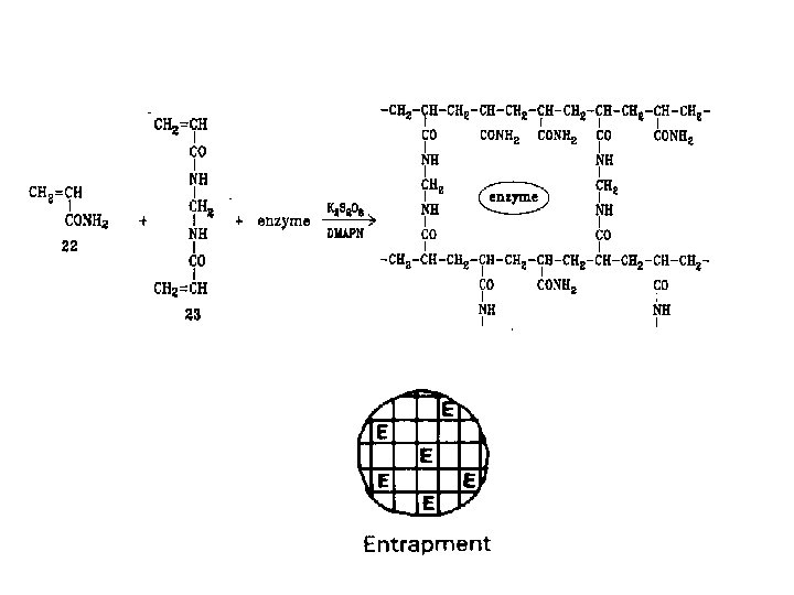 • Gel entrapment places the enzyme within the interstitial • spaces of crosslinked, water-insoluble polymer gels. • Polyacrylamide gels: • Polysaccharides: The solubility of alginate and k. Carrageenan varies with the cation, allowing these soluble polymers to be crosslinked upon the addition of Ca. Cl 2 and KCl, respectively. • Variations of pore size result in enzyme leakage, even after washing. The effect of initiator used in polyacrylamide gels can be problematic. cont……….