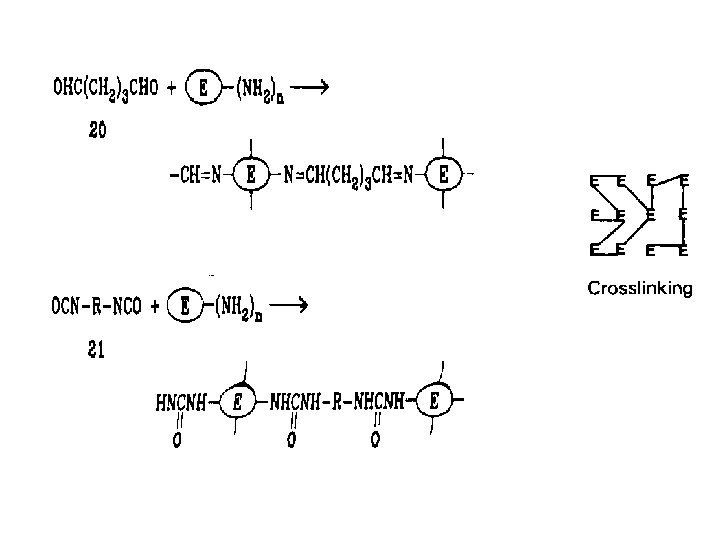 Immobilization by Crosslinking • Bi- or multi-functional compounds serve as reagents for intermolecular crosslinking of enzymes, • creating insoluble aggregates that are effective heterogeneous catalysts. • Reagents commonly have two identical functional groups which react with specific amino acid residues. • Common reagents include glutaraldehyde, carbodimide and diisocyanates, • Involvement of the active site in crosslinking can lead to great reductions in activity, and the gelatinous nature of the product can complicate processing.