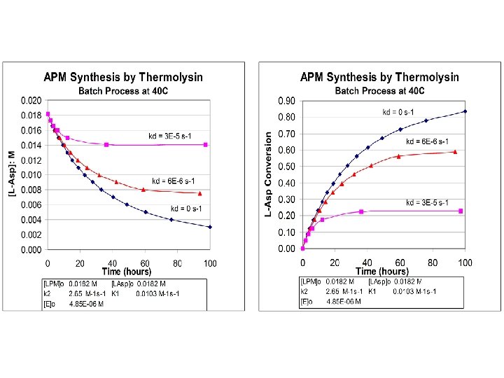 Effect of Thermolysin Instability on APM Production • The evolution of [L-Asp] and conversion with time for a batch process is shown below. – Depending on the relative rates of reaction and enzyme deactivation, the ultimate conversion can be strongly affected