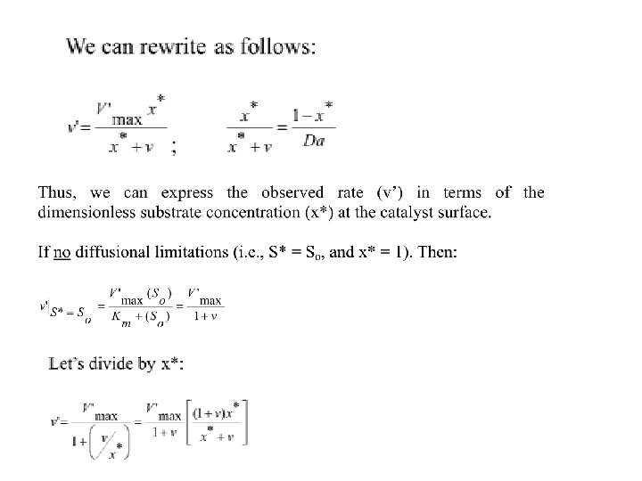 External Mass Transfer The governing expression is the Nernst equation: ks = Mass transfer coefficient (cm/sec). This is determined from well-established, empirical correlations; S* = Substrate concentration at the solid-liquid interface; So = Substrate concentration in the bulk solution. At steady state, the enzymatic reaction rate cannot exceed the rate of substrate diffusion to the enzyme. This can be written as follows: