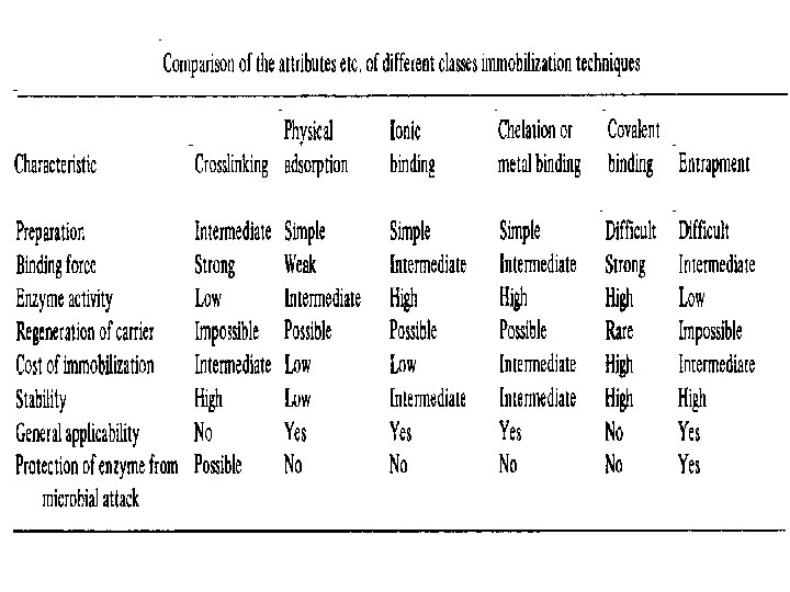 Selecting an Immobilization Technique • It is well recognized that no one method can be regarded as the universal method for all applications or all enzymes. Consider, – widely different chemical characteristics of enzymes – different properties of substrates and products – range of potential processes employed