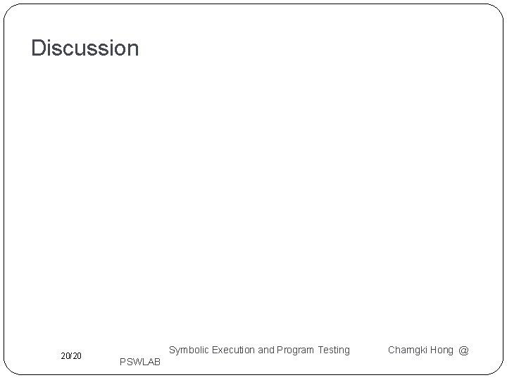 Discussion 20/20 Symbolic Execution and Program Testing PSWLAB Charngki Hong @