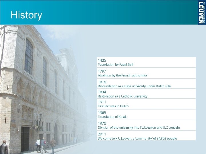 Historiek begeleiding studenten met een functiebeperking (1) • 1973: Start uitbouw begeleiding studenten met een functiebeperking (Myriam Van Acker) – Geen extra personeelstijd, noch wettelijke basis • 1974: Start van de Werkgroep Gehandicapte Studenten – – Peer begeleiding als kenmerk van de Leuvense aanpak Medewerking van de technische diensten om gebouwen toegankelijk te maken • 1993: Romerohuis als symbool van zelfstandig en begeleid wonen • 1995: Award voor uniek concept omkaderd wonen: – – Zilveren medaille van Helios II [EU] K. U. Leuven voortrekkersrol in Europa