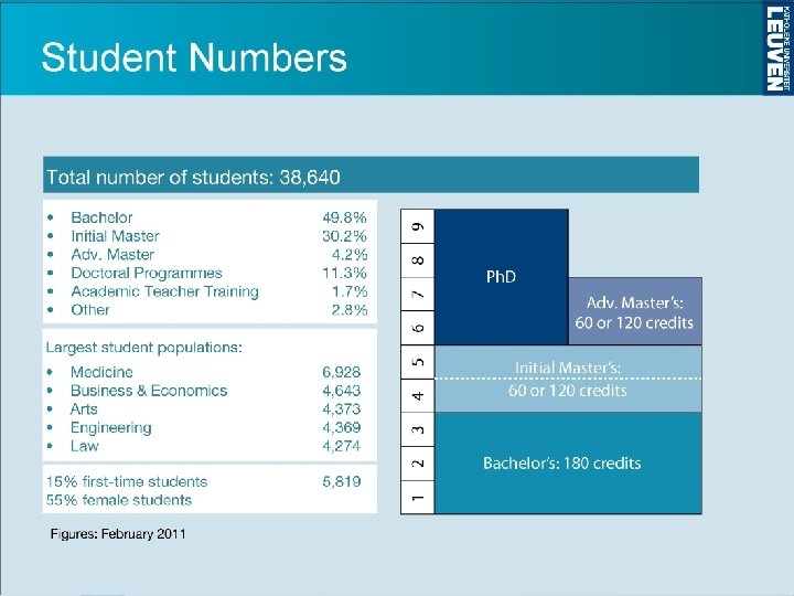 Historiek begeleiding studenten met een functiebeperking (2) • 2000: Oprichting Werkgroep Psychosociale Omkadering voor de begeleiding van studenten met een psychiatrische functiebeperking • 2007: Oprichting Cel Studeren met een functiebeperking – Dienst Studentenvoorzieningen – Uitbreiding zorgcoördinatie • 2011: opening nieuwe Residentie De Vesten met 2 gangen voor omkadering