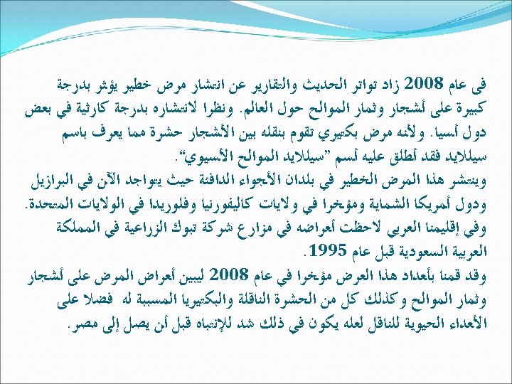 References (Continue) ﺗﺎﺑﻊ ﺍﻟﻤﺮﺍﺟﻊ 5 - Grafton-Cardwell, E. E; K. E. Godfrey; M. E. Rogers; C. C. Childers; and P. A. Stansly (2006). Asian Citrus Psyllid. University of California, Division of Agriculture and Natural Resources (ANR) Publication number 8205. 6 - Texas Citrus Greening Task Force (2009): Texas Citrus Greening and Asian Citrus Psyllid Action Plan: pp: 35.