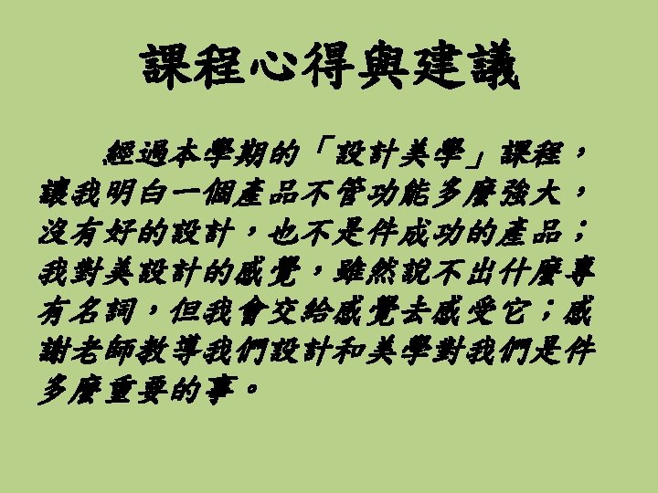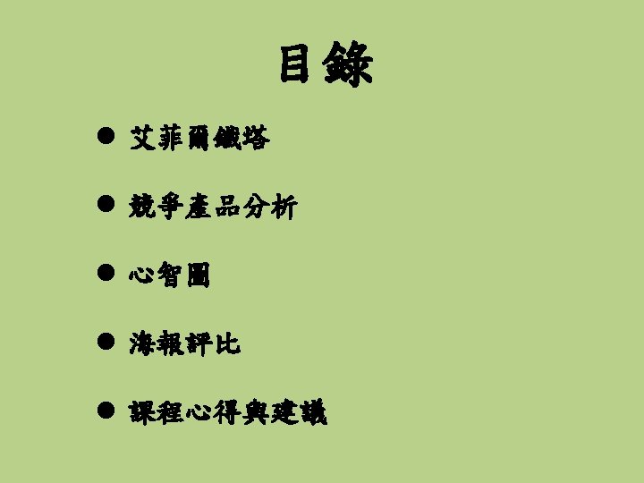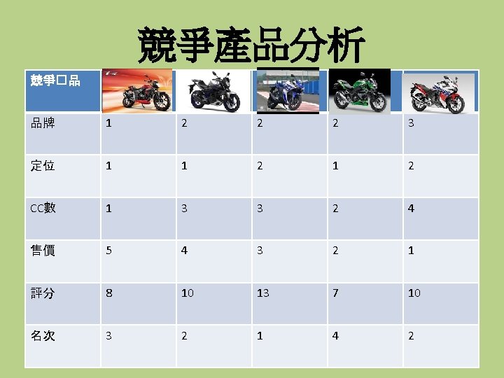SYMT 3 YAMAHA MT03 YAMAHA R 3 KAWASAKI Slides: 11 Download presentation 競爭產品分析 競爭�品 品牌 SYM-T 3 YAMAHA MT-03 YAMAHA R 3 KAWASAKI Z 300 HONDA CBR 500 R CC數 278. 3 CC 321 CC 296 CC 500 CC 定位 街車 街車 街跑 售價 NT 189, 000 NT 228, 000 NT 238, 000 NT 318, 000 NT 360, 000 海報評比 金牌特務電影海報 • • • 字體字型: 簡單 色彩: 反差大 背景: 人物 顯示顏色: 與真實色彩無差異 敘述: 雖然看起來簡單, 但有種英國紳士優雅, 背 景全黑, 有種畫龍點睛的感覺, 重點電影好看 引用來源: https: //www. google. com. tw/search? rlz=1 C 1 AS UC_en. TW 645&espv=2&biw=1920&bih=9 55&tbm=isch&sa=1&q=%E 9%87%91%E 7%89%8 C%E 7%89%B 9%E 5%8 B%99%E 9%9 B%BB%E 5%B D%B 1%E 6%B 5%B 7%E 5%A 0%B 1&oq=%E 9%87% 91%E 7%89%8 C%E 7%89%B 9%E 5%8 B%99%E 9%9 B%BB%E 5%BD%B 1%E 6%B 5%B 7%E 5%A 0%B 1&gs _l=img. 3. . . 172491. 0. 172810. 1. 1. 0. 0. 53. 1. 1. 0. . . 1 c. 1. 64. img. . 1. 0. 0. Mr. Jz. RE 2 Xigk (優) 海報評比 志氣電影海報 • • • (不優) 字體字型: 普通 色彩: 鮮明 背景: 操場, 人物 顯示顏色: 與真實色彩無差異 敘述: 遠景有點太雜亂了, 一大多女生在賣萌, 看 不出有志氣的感覺 引用來源: https: //www. google. com. tw/search? rlz=1 C 1 AS UC_en. TW 645&espv=2&biw=1920&bih=9 55&tbm=isch&sa=1&q=%E 5%BF%97%E 6%B 0%A 3%E 9%9 B%BB%E 5%BD%B 1%E 6%B 5%B 7%E 5%A 0%B 1&oq=%E 5%BF%97%E 6%B 0%A 3%E 9%9 B%B B%E 5%BD%B 1%E 6%B 5%B 7%E 5%A 0%B 1&gs_l=i mg. 3. . . 188111. 0. 188383. 1. 1. 0. 0. 70. 7 0. 1. 1. 0. . . 1 c. 1. 64. img. . 1. 0. 0. NTu. Rq. Pfjp. Vc