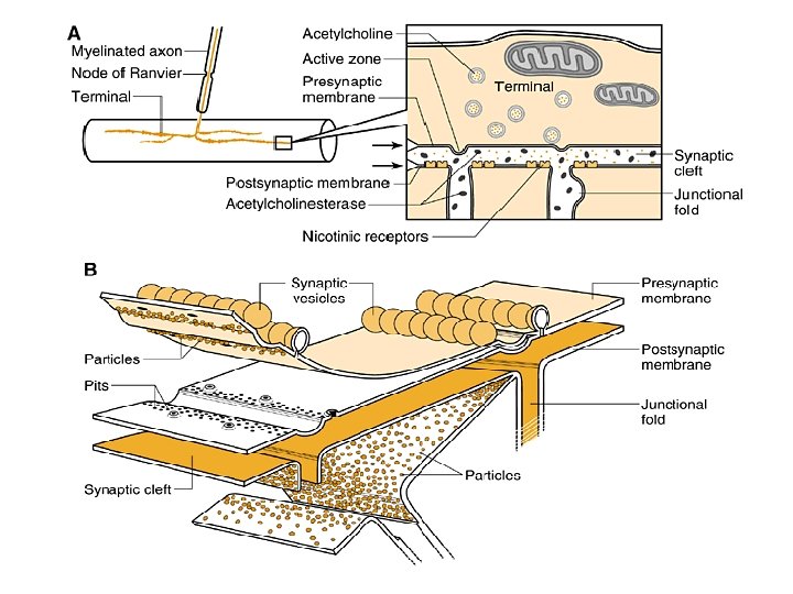 Neuromuscular junction: ACh release and postsynaptic effect 1. There approximately 300 active zones per NMJ; 500, 000 vesicles in all of the active zones at one NMJ. It is estimated a vesicle contains 20, 000 ACh molecules. 2. The specialized postsynaptic membrane structure consists a high density of nicotinic ACh receptors (n. ACh. Rs) 3. Basal lamina matrix proteins are important for the formation and maintenance of the NMJ and are concentrated in the cleft; enriched with ACh. E.