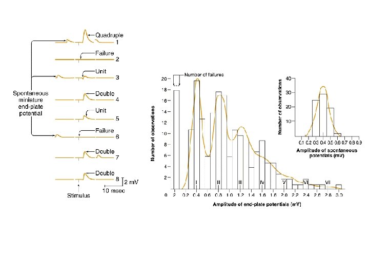 Quantum release : mechanism of release as Exocytosis 1. Fatt and Katz (1952) observed motor neuron stimulation results in spontaneous potentials of approximately 1 m. V at the motor end plate (miniature end-plate potentials [MEPPs]). 2. Measurement of quantum release: amplitude fixed; but number variated.