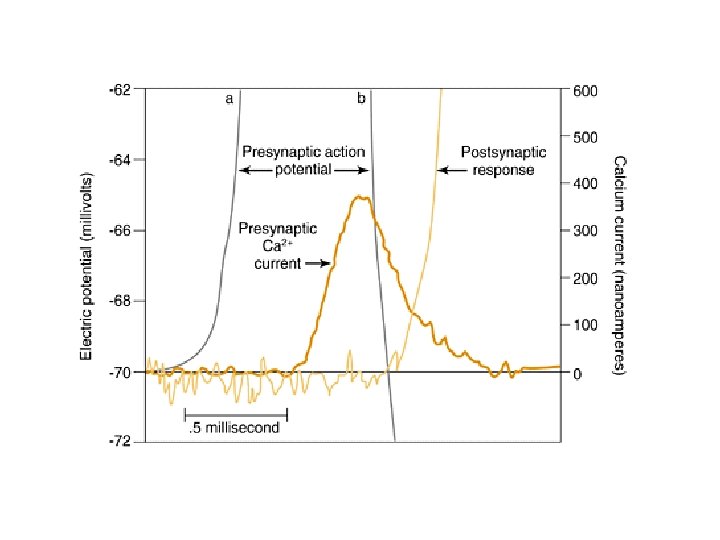 Calcium is necessary for transmission at the NMJ and other synapses 1. In most cases in the CNS and PNS, chemical transmission does not occur unless Ca 2+ is present. 2. EPPs could not be elicited if the calcium pulse immediately followed the depolarization; but should be beforehand (pulse as short as 1 msec preceded the depolarization). 3. Extracellular calcium: 2 m. M vs. intracellular 0. 1 M; the requirement to activate calcium channels: 50 -100 M. 4. Origin of calcium could be extracellular (thru voltagedependent Ca 2+ channel) or intracellular: GPCR-coupled PI-PLC activation release IP 3, thus Ca 2+ release from ER