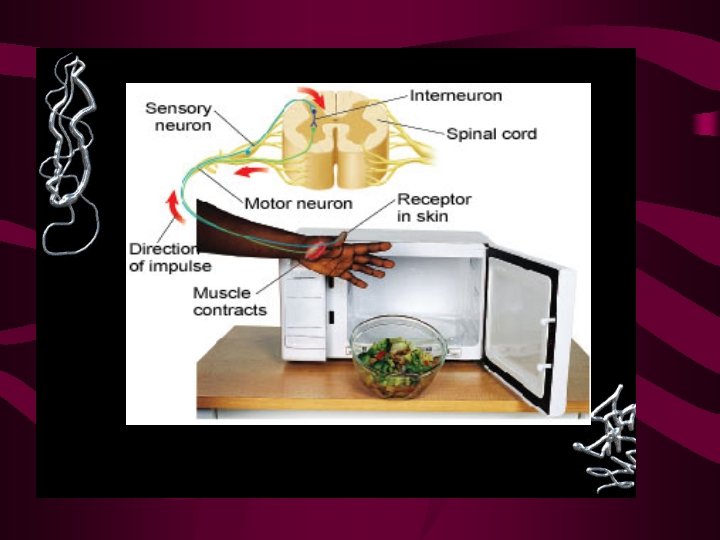 Functions of reflexes: • • Help control heartrate Respiratory rate Blood pressure Digestion Examples: withdrawal, knee jerk