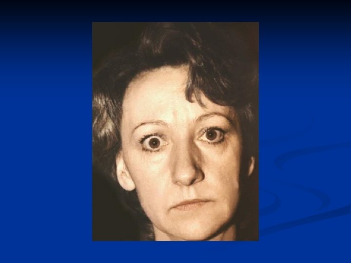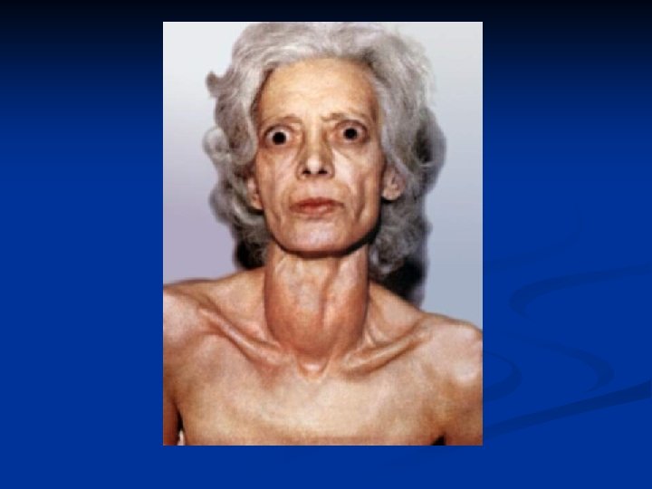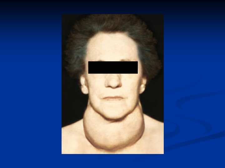 Diffuse toxic goiter Clinical manifestations Physical examination n n n Goiter Warm, moist skin Hairs are fine, and a diffuse alopecia occurs in up to 40% of patients Muscle weakness, proximal myopathy Lid retraction or lag Thyroid gland: diffusely enlarged, soft or slightly firmed, painless on palpation , systolic murmur on auscultation Enlargement of thyroid: n n n 0 – normal size I – larger than distal phalanx of patient’s thumb on palpation, not visible II - detectable on palpation, visible