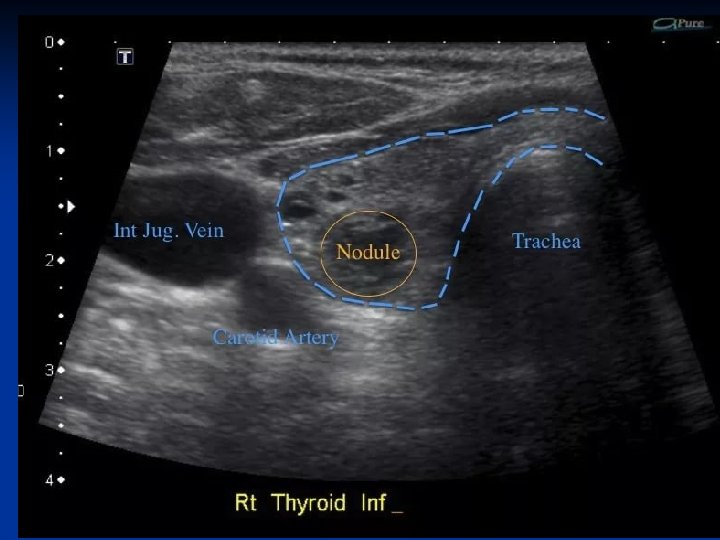 Diffuse toxic goiter THYROID ULTRASOUND Ultrasonography is used to assist in the diagnosis of nodular thyroid disease. In addition to detecting thyroid nodules, ultrasound is useful for monitoring nodule size, for guiding biopsies, and for the aspiration of cystic lesions.