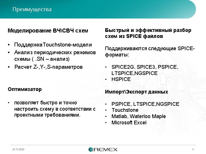 Моделирование электронных схем общего назначения Компания Продукт Synopsys, США HSPICE Cadence Design Systems, Inc, США Or. Cad 16. 5 PSPICE AD Mentor Graphics, США Hyper. Lynx Analog Altium Designer, Австралия Mixedsim National Instruments, США Multi. Sim 13 Spectrum Software, США Micro-Cap 11 Linear Technology, США LTSPICE IV(бесплатн) Texas Instruments, США Tina-Ti (бесплатн) 26. 11. 2020 3