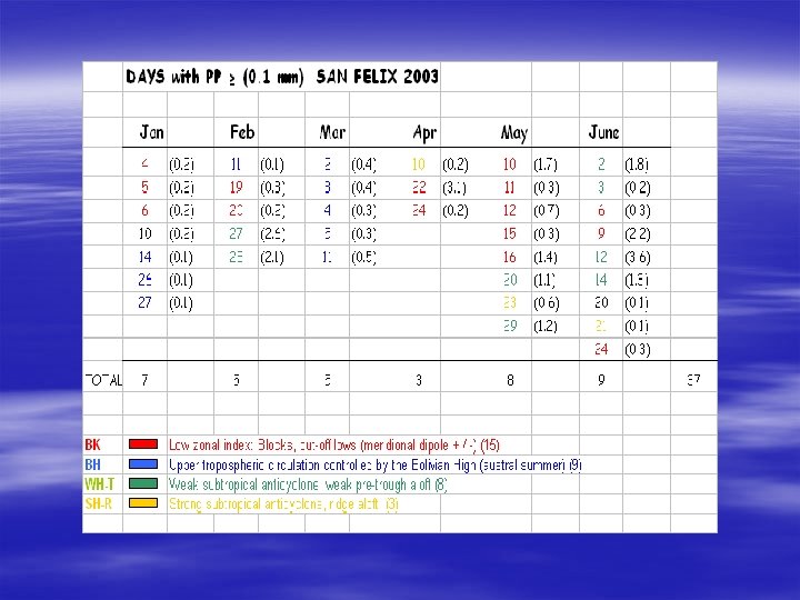 ![SAN FELIX ISLAND Precipitation Events May 2003 DAY HOUR OBS. PP[mm] CL oktas CL SAN FELIX ISLAND Precipitation Events May 2003 DAY HOUR OBS. PP[mm] CL oktas CL](https://slidetodoc.com/presentation_image/42ecf919fd70f45a1b87961ca563029f/image-21.jpg)