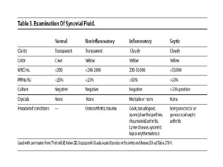 Indications • Suspected septic arthritis – Any febrile person with unexplained inflammatory fluid -> presumed septic joint – Even with acute flare of arthritis (e. g. , RA), should rule out septic joint • Suspected crystal-induced arthritis – Gout or pseudogout diagnosis largely made with microscopic examination – Diagnosis requires negative Gram stain/culture • Unexplained joint or bursa swelling – Largely to permit classification into inflammatory vs noninflammatory categories – Diagnosis made along with history & physical.