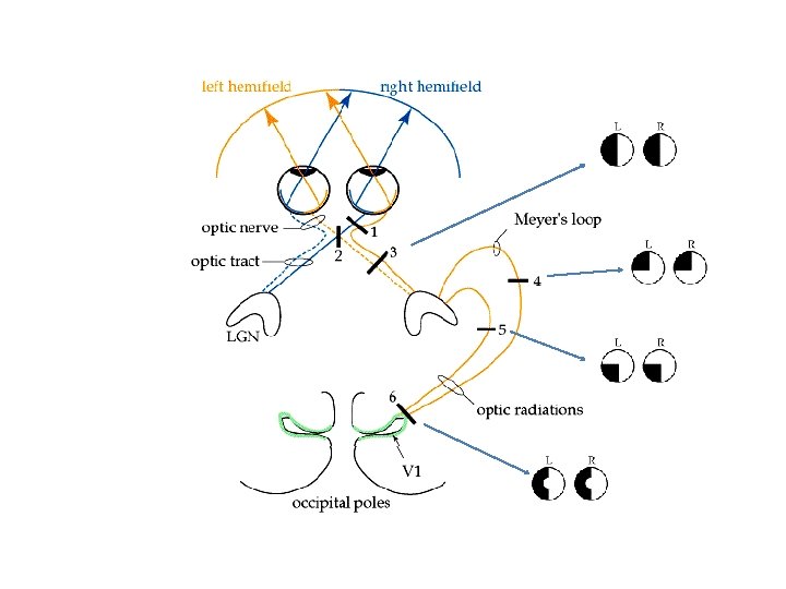 Hemianopsi: Synsdefekt som er begrenset til halve synsfeltet. Homonym hemianopsi: Samme halve synsfeltet på begge øynene. Heteronym hemianopsi: Motstående halvdel. Kvadrant anopsi: Blindhet for ett av de fire kvadrater i synsfeltet. 40 % skyldes skade i oksipitallappene. 30 % skyldes skade i parietallappene. 25 % skyldes skade i temporallappene. 5 % skyldes skade i synstrakten og knekroppen. 5% temporallapp 25 % (tinninglapp) parietallapp 30 % (isselapp) oksipitallapp 40 %