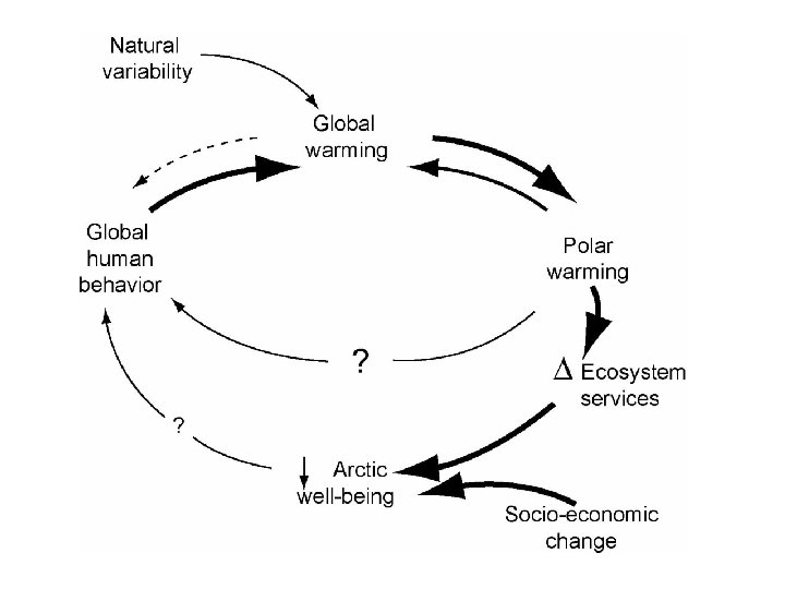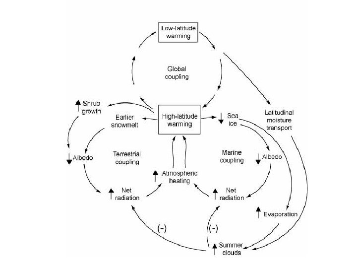 Table 1 A summary of the major positive and negative feedbacks to the climate system from responses of the Arctic to ongoing and projected climate change in the region Positive Feedbacks Effect on Forcing Negative Feedbacks Effect on Forcing Increasing water vapor in the atmosphere Water vapor as a greenhouse gas Increasing cloudiness, more deciduous forest from more frequent disturbance, and enhanced aerosols from more frequent fire and more production of dimethylsulfide in the Arctic Ocean Increase in albedo Decreased snow and ice cover, increase in tundra shrubs, expansion of evergreen conifer forest, and soot on snow and ice from more frequent fires Decrease in albedo Increased carbon storage by terrestrial plants from enhanced growth and increased uptake of carbon dioxide by marine plants Carbon dioxide as a greenhouse gas Carbon dioxide release from decomposition of soils, more frequent disturbance, and enhanced coastal erosion Carbon dioxide as a greenhouse gas Political pressure by arctic residents for decision makers to more effectively control greenhouse gas concentrations Carbon dioxide as a greenhouse gas Methane release from temperature sensitivity of methanogenic microbial processes and thawing of permafrost Methane as a greenhouse gas Increasing freshwater inputs to the Arctic Ocean and North Atlantic from melting of sea ice and glaciers, increase in precipitation, and increase in river discharge to the Arctic Ocean Shut down of the global thermohaline circulation