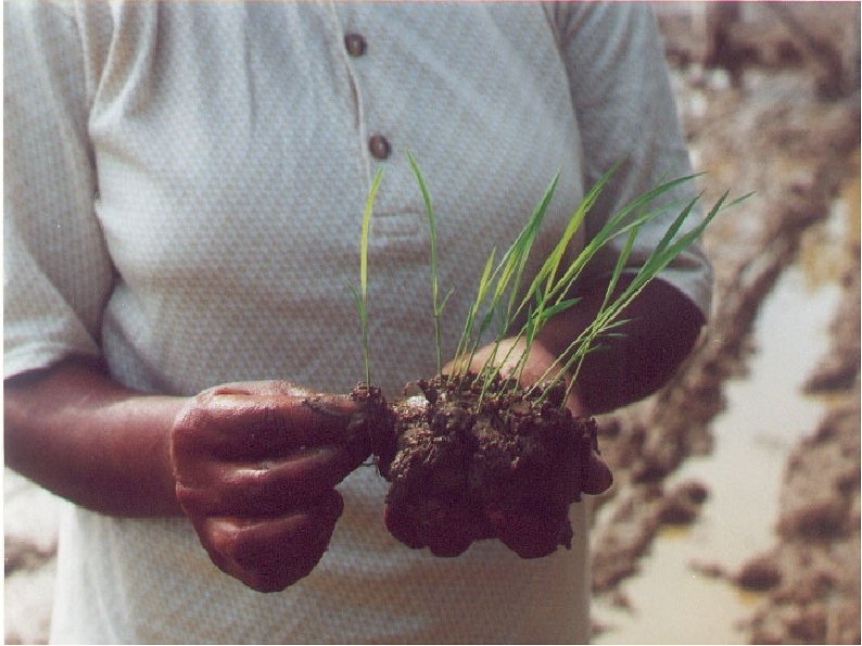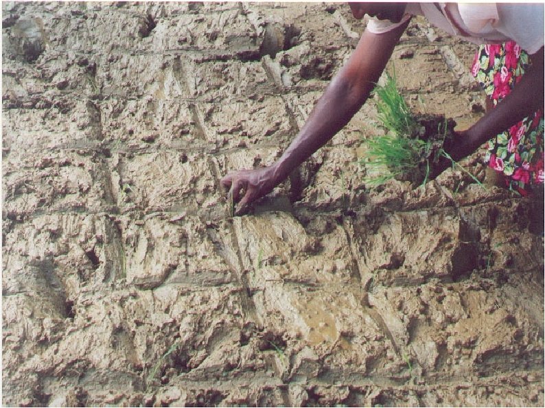 Transplanting The field should be level, but not flooded (drain the field the night before transplanting) Mark the field with a 25 x 25 cm grid pattern With one hand, get from the seedbed a piece of soil; seedlings should be undisturbed in the soil In the field, take a clump of soil with just one seedling, and gently transplant it into the mud Like moving a baby from the crib, to the bed.