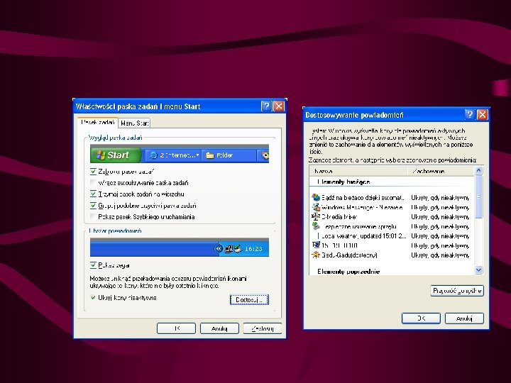 Aplikacje służące do komunikacji z internetem • Usługa www – Internet Explorer • Usługa poczty elektronicznej – Outlook Express • Usługa news (Grupy dyskusyjne) – Outlook Express • Usługa ftp – częściowo przez Internet Explorer, także w trybie tekstowym – b. trudna obsługa • Usługa telnet – Telnet, brak obsługi ssh • Brak obsług IRC