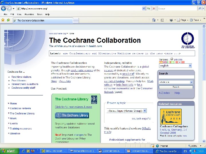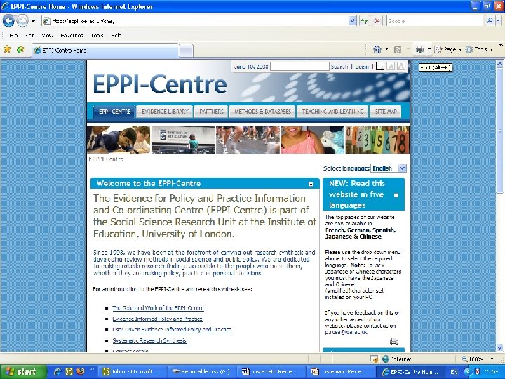 SR websites Centre for Evidence-based Conservation -http: //www. cebc. bangor. ac. uk/ Centre for Reviews and Dissemination (medical) -http: //www. york. ac. uk/inst/crd/index. htm Cochrane Collaboration (international- medical) -http: //www. cochrane. org/ EPPI-Centre, Institute of Education - http: //eppi. ioe. ac. uk/cms/ Social Policy and Social Care -http: //www. york. ac. uk/inst/chp/srspsc/index. htm If you read one article, an example here of a review of the ways studies in reviews are appraised - http: //www. pubmedcentral. nih. gov/articlerender. fcgi? artid=521688 If you prefer power-point, how about this one on mixed method reviews http: //www. ccsr. ac. uk/methods/events/challenges/documents/James. Thomas. ESRCMeth odologicalchallenges. ppt