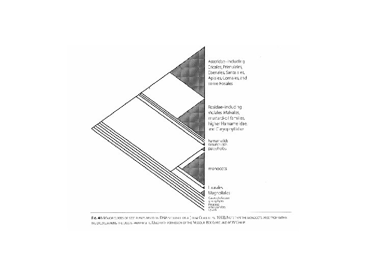 2. Cladists or phylogenetic classification -does not use binomial nomenclature or ranks -only examines the branching patterns of evolution using phylogenetic trees that reflect monophyletic groups -only recognizes monophyletic groups, so Asclepiadaceae becomes part of Apocynaceae and birds part of Reptilia (Figs. 39 and 40) -cladogram using DNA sequence data indicates that monocots are derived from within dicots making the dicot group paraphyletic (Fig. 41)