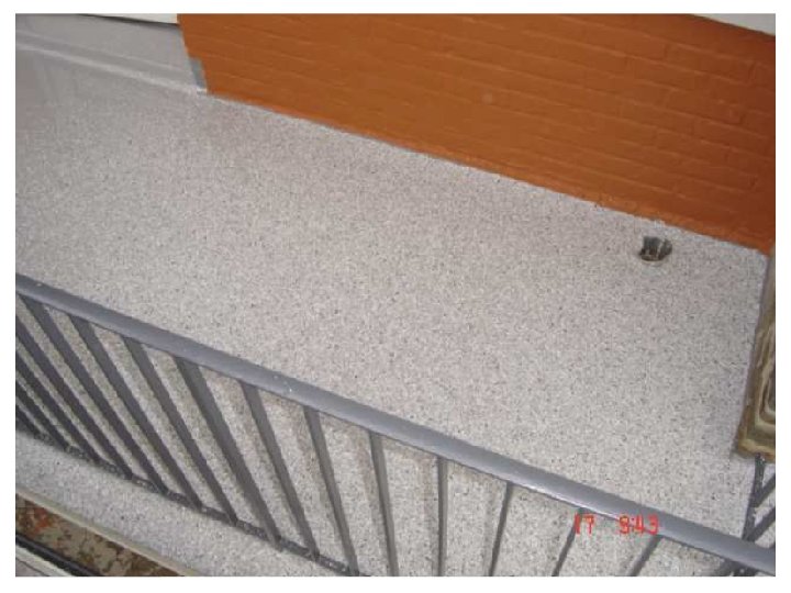 Étanchéité liquide et finition d'un balcon ayant un support en béton 1 : Support 2 : Primaire 3 : 1ère couche 4 : Voile de renfort 5 : 2ème couche 6 : Couche de finition 7 : Vernis