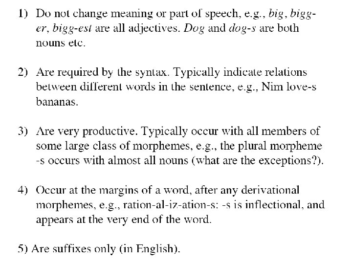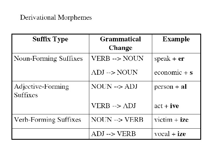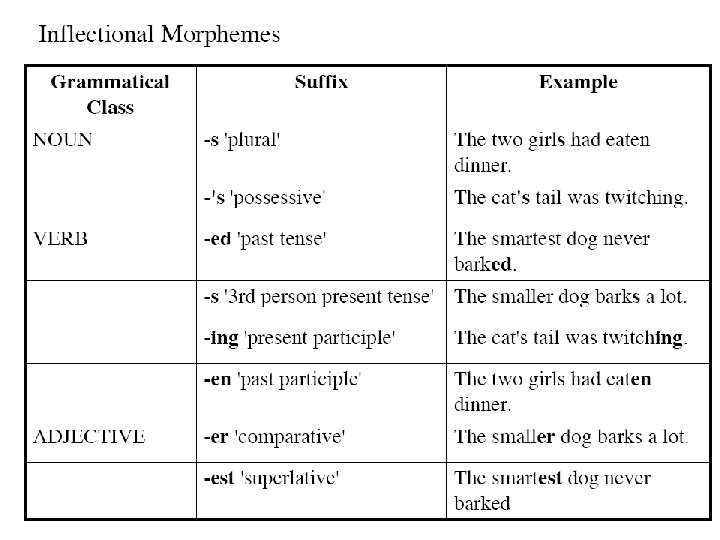 • types of inflection • a) declension of nouns, adjectives, and pronouns • b) conjugation of verbs. • derivational morphemes (affixes) are used for word formation
