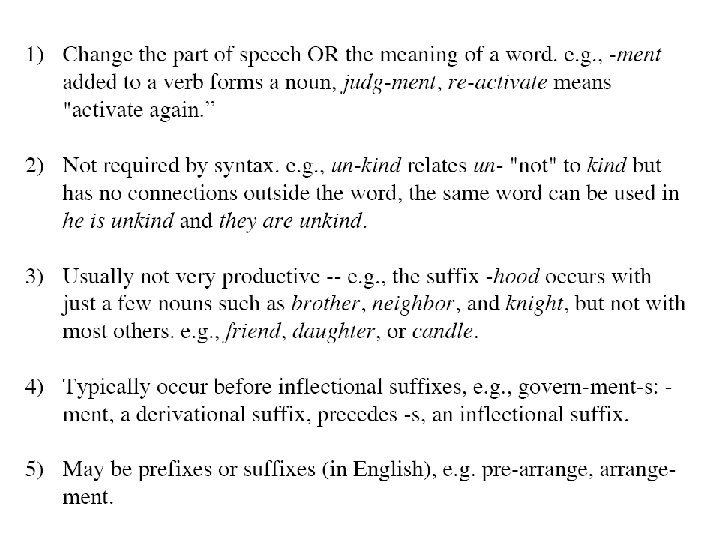 derivation: exceptions • Cranberry morph(eme)s are bound morphemes which occur in only one derivation (or compound) but nowhere else: e. g. cranberry, inane, umpteen • similar words (strawberry, inactive, thirteen) suggest that they are indeed morphemes • cranberry morphs are relics of words which have died out in other uses