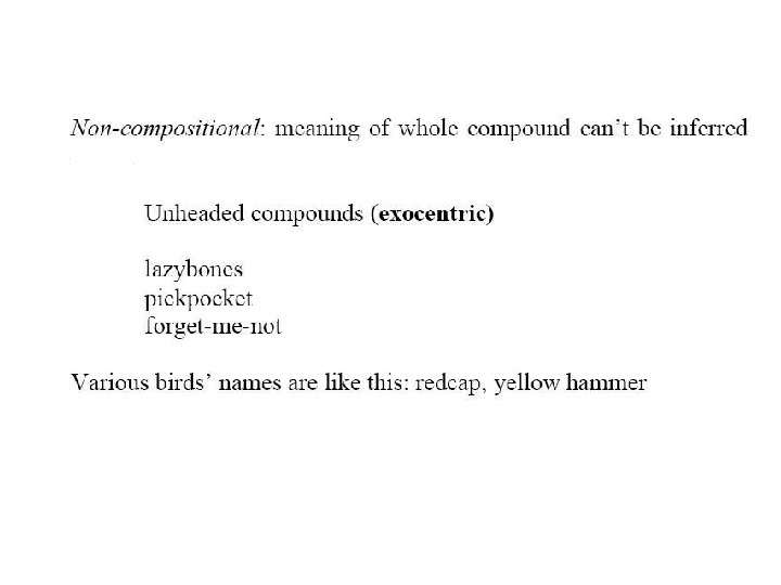• examples of exocentric compounds: paleface, redskin, redneck, skinhead, bigfoot, pickpocket • Copulative compounds: both constituents refer to the entity denoted by the whole compound. An owner-builder is both an owner of a house and its builder. • e. g. singer-songwriter, bittersweet, deafmute