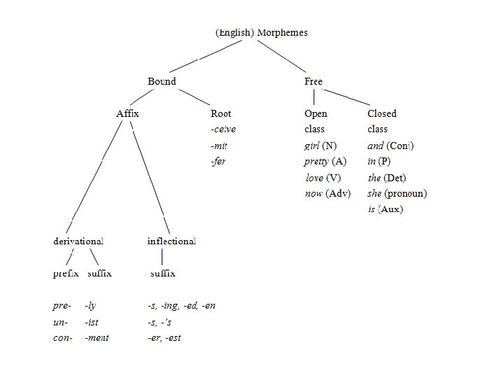 • types of morphemes: • a) free morphemes: may occur on their own and are used freely according to the rules of sentence structure, for example 'boy', 'tree', 'church', 'go', 'leave', 'love'. • b) bound morphemes (affixes): cannot usually stand alone but are attached to a free morpheme (= 'base'), e. g 're-', '-ed', 's'.